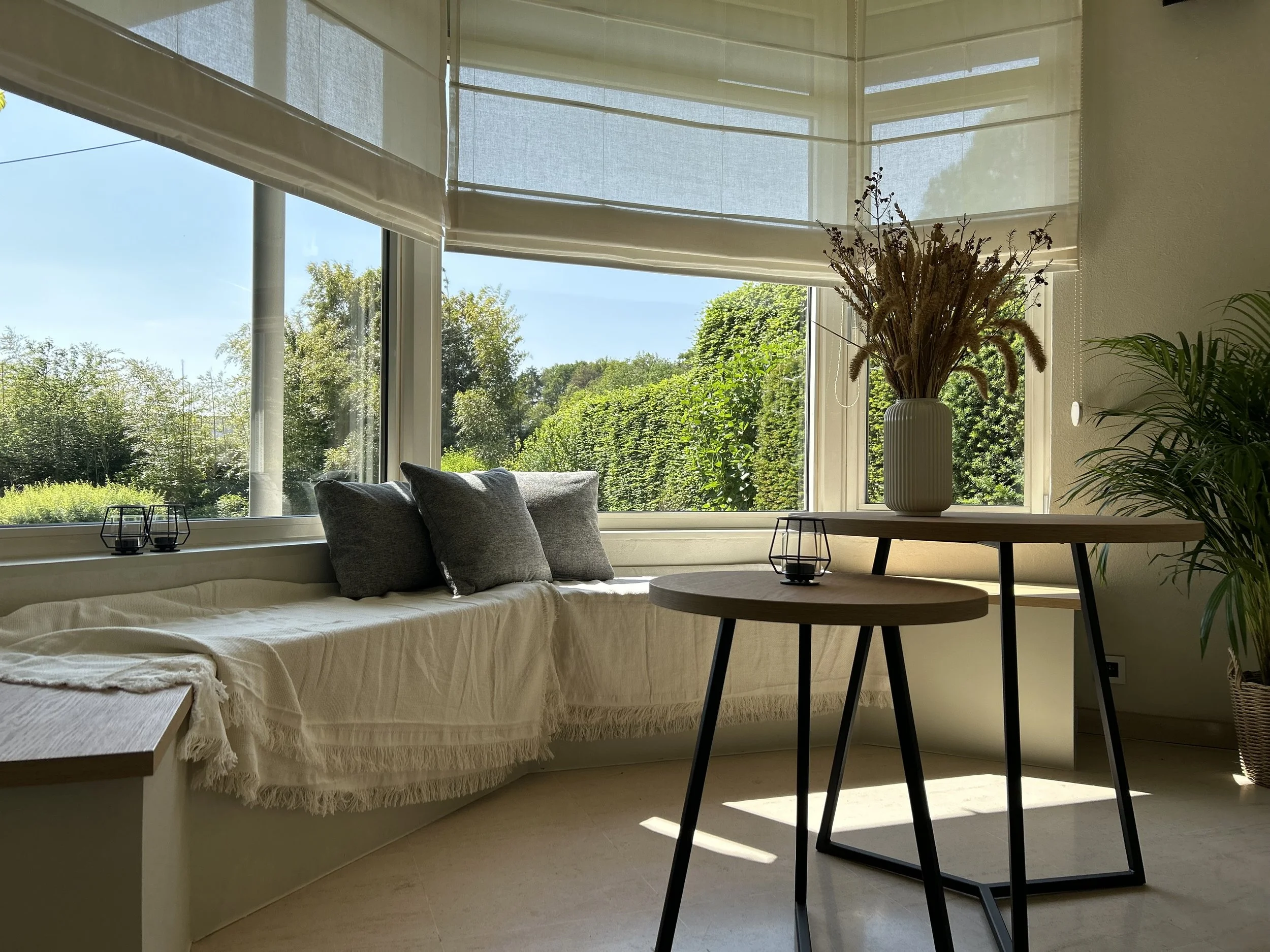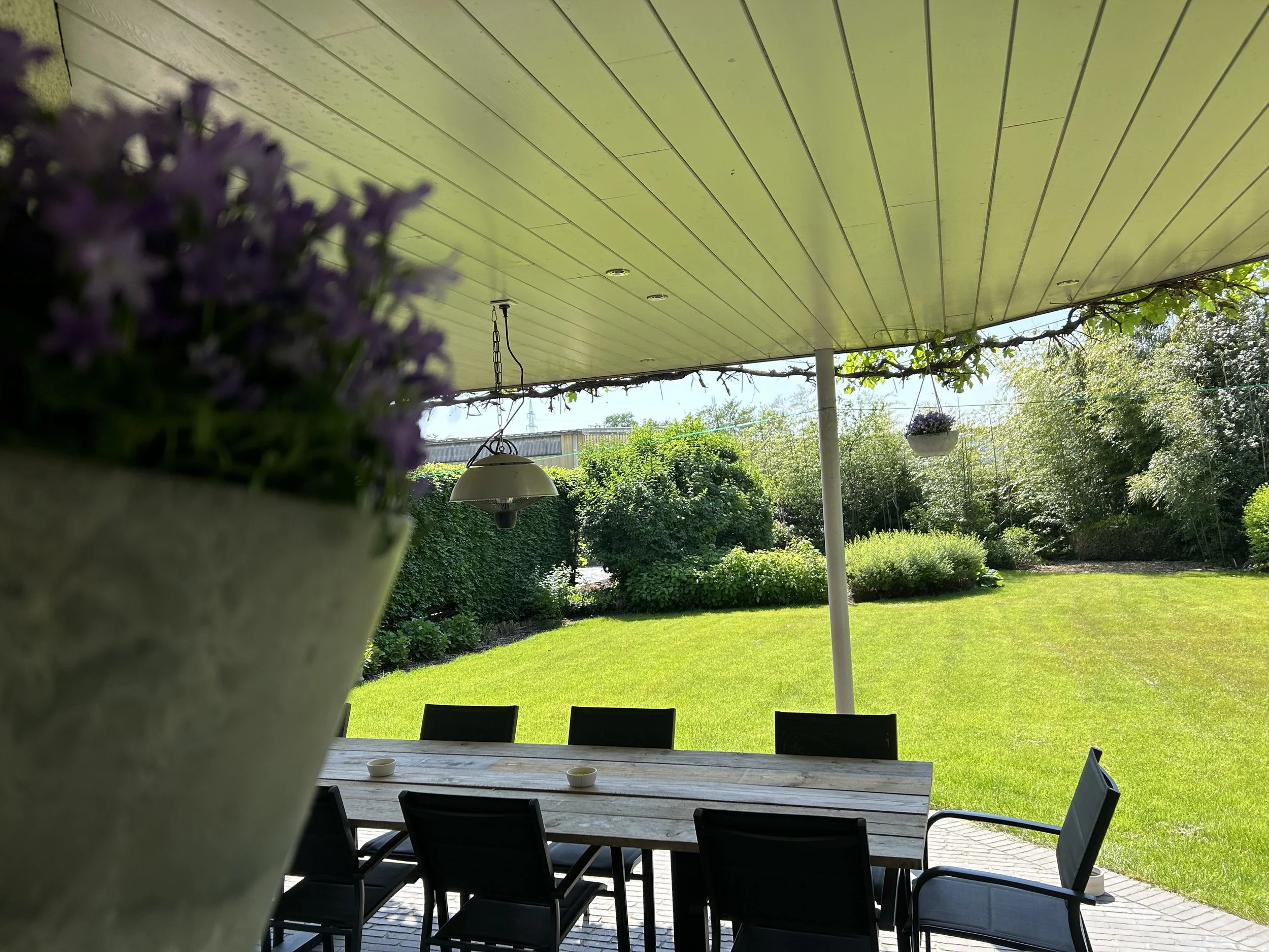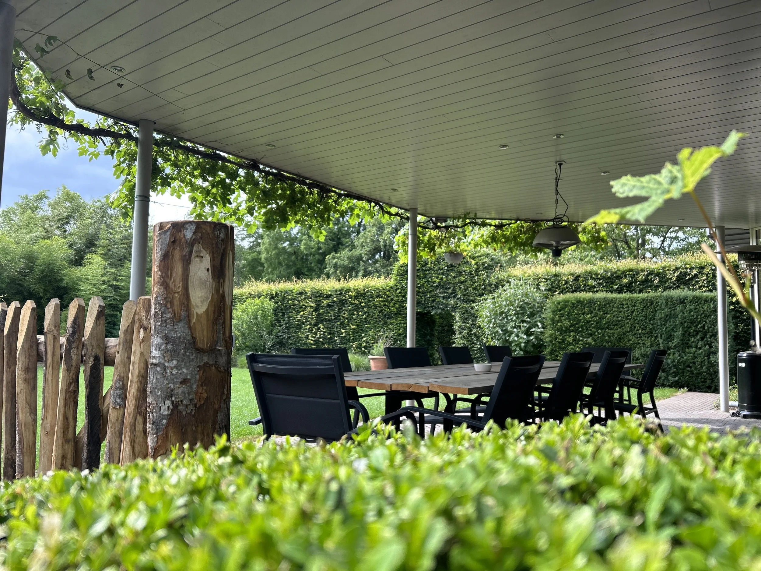 Overdekt terras met uitzicht op weelderige tuin