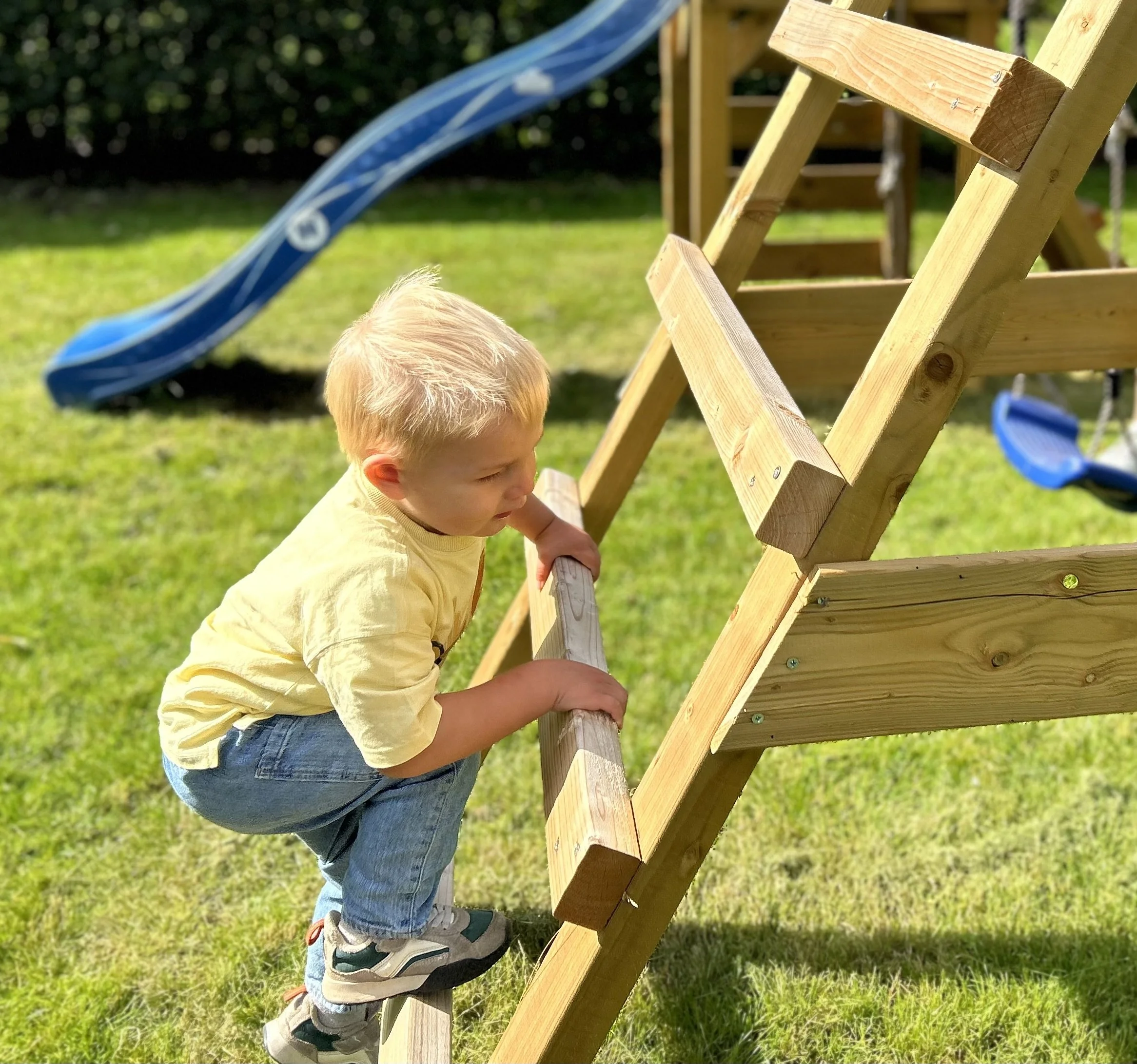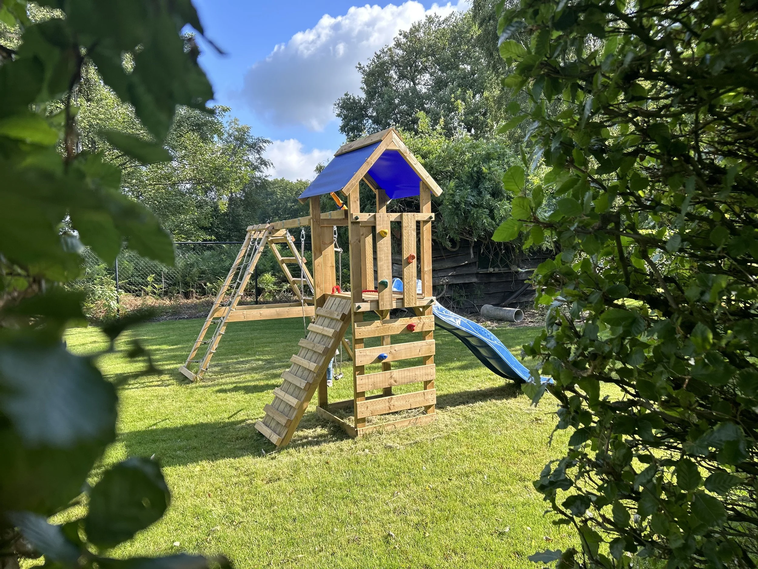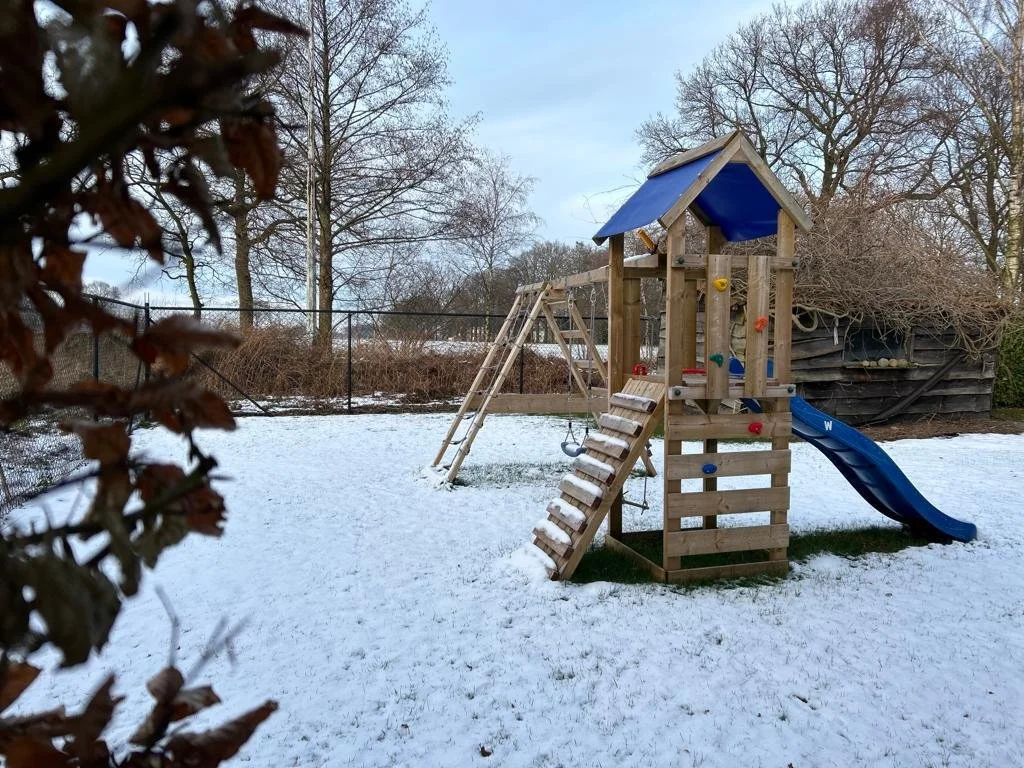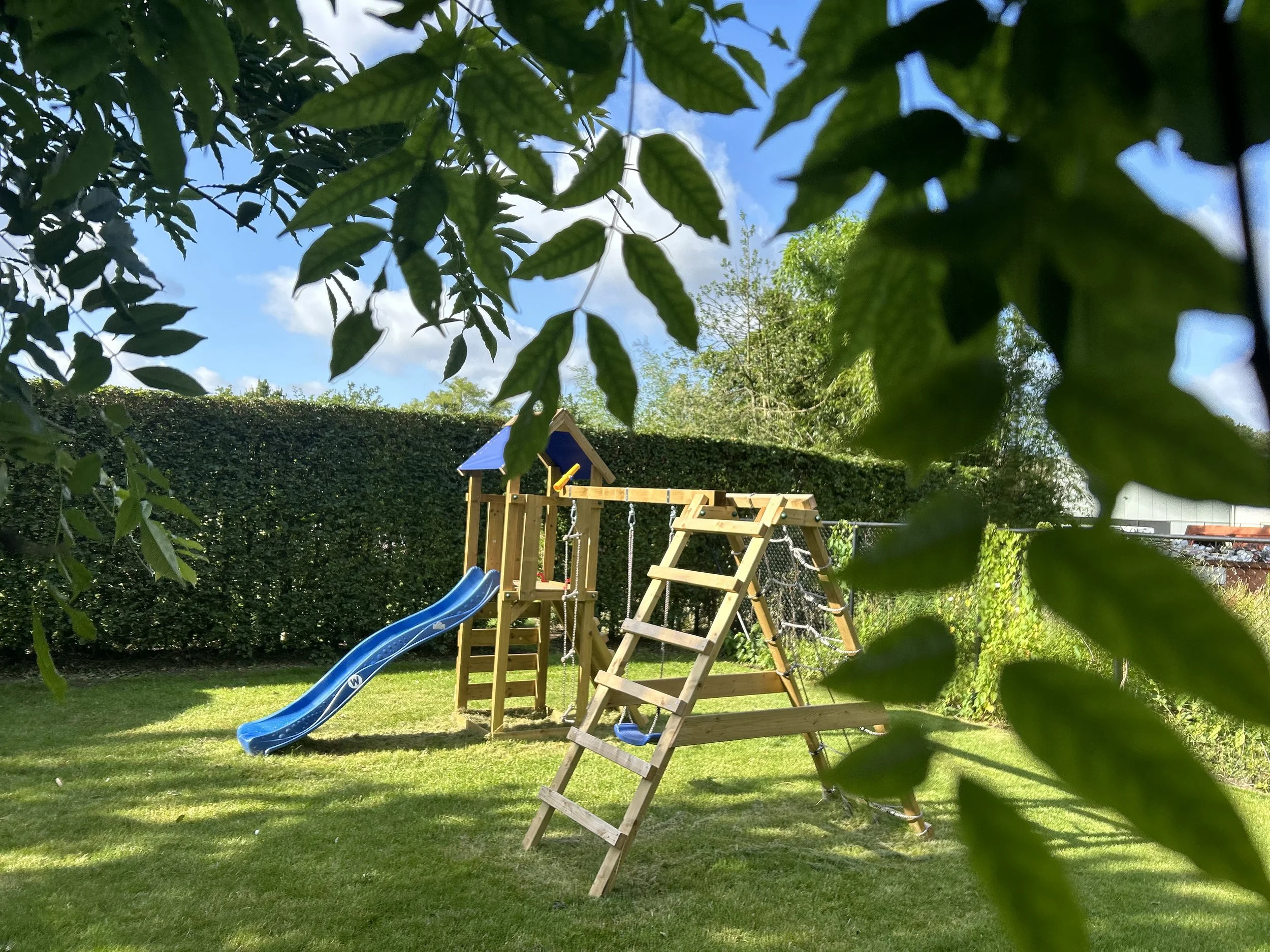 Omheinde achtertuin met aparte speelweide met speeltoestel