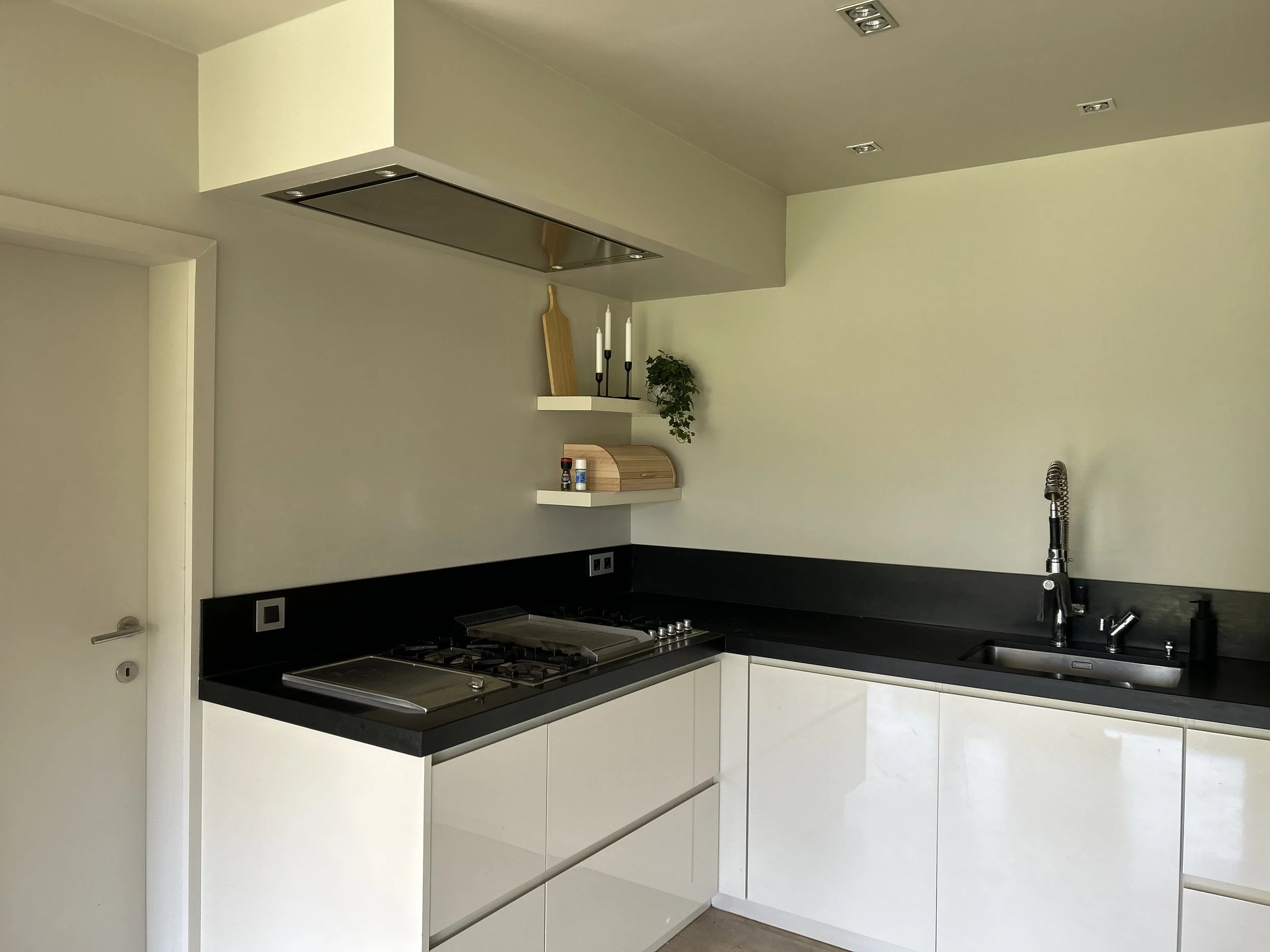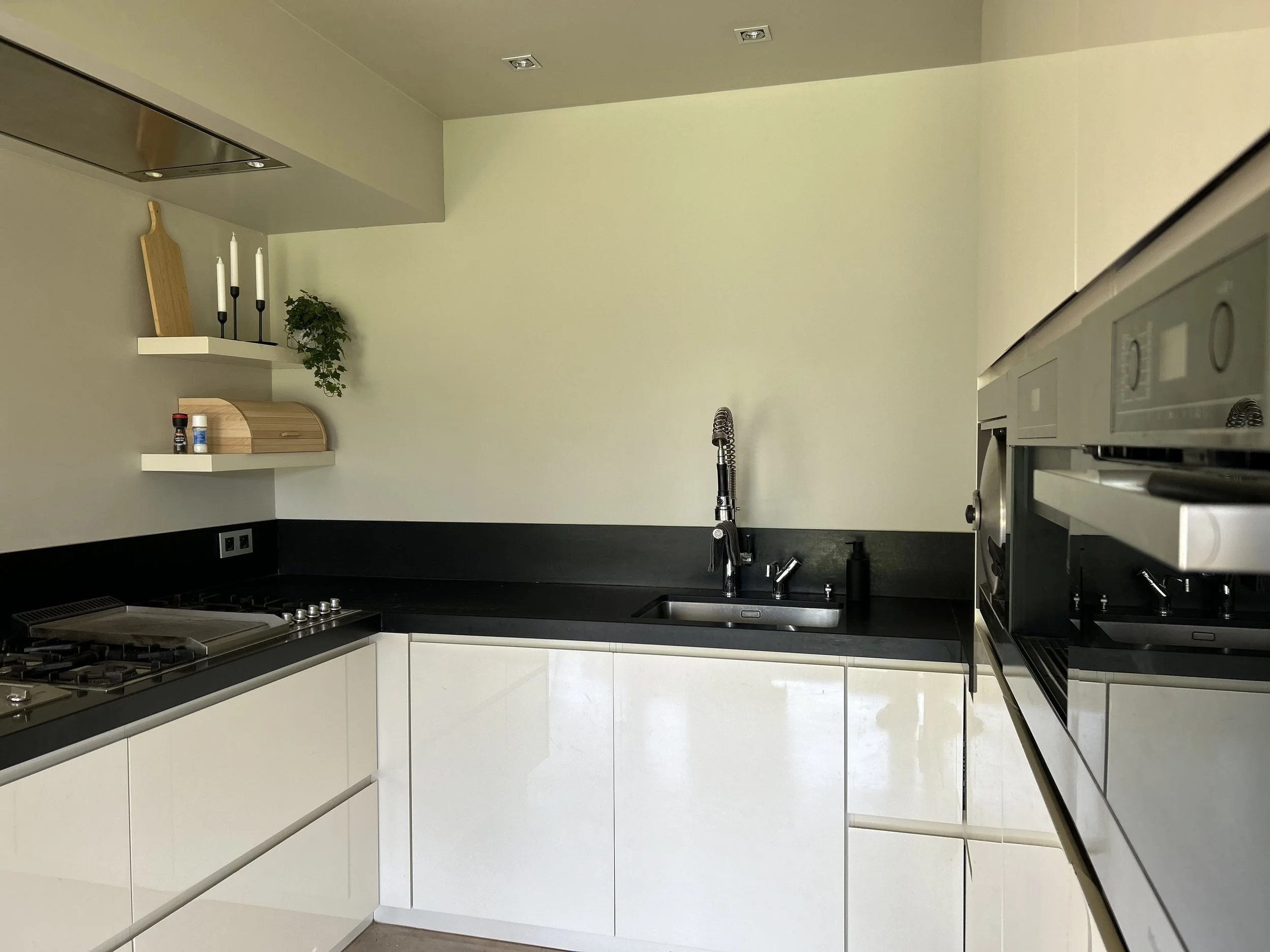 Praktische hedendaagse keuken met diverse apparatuur, waaronder ingebouwd koffieapparaat en Quooker kraan